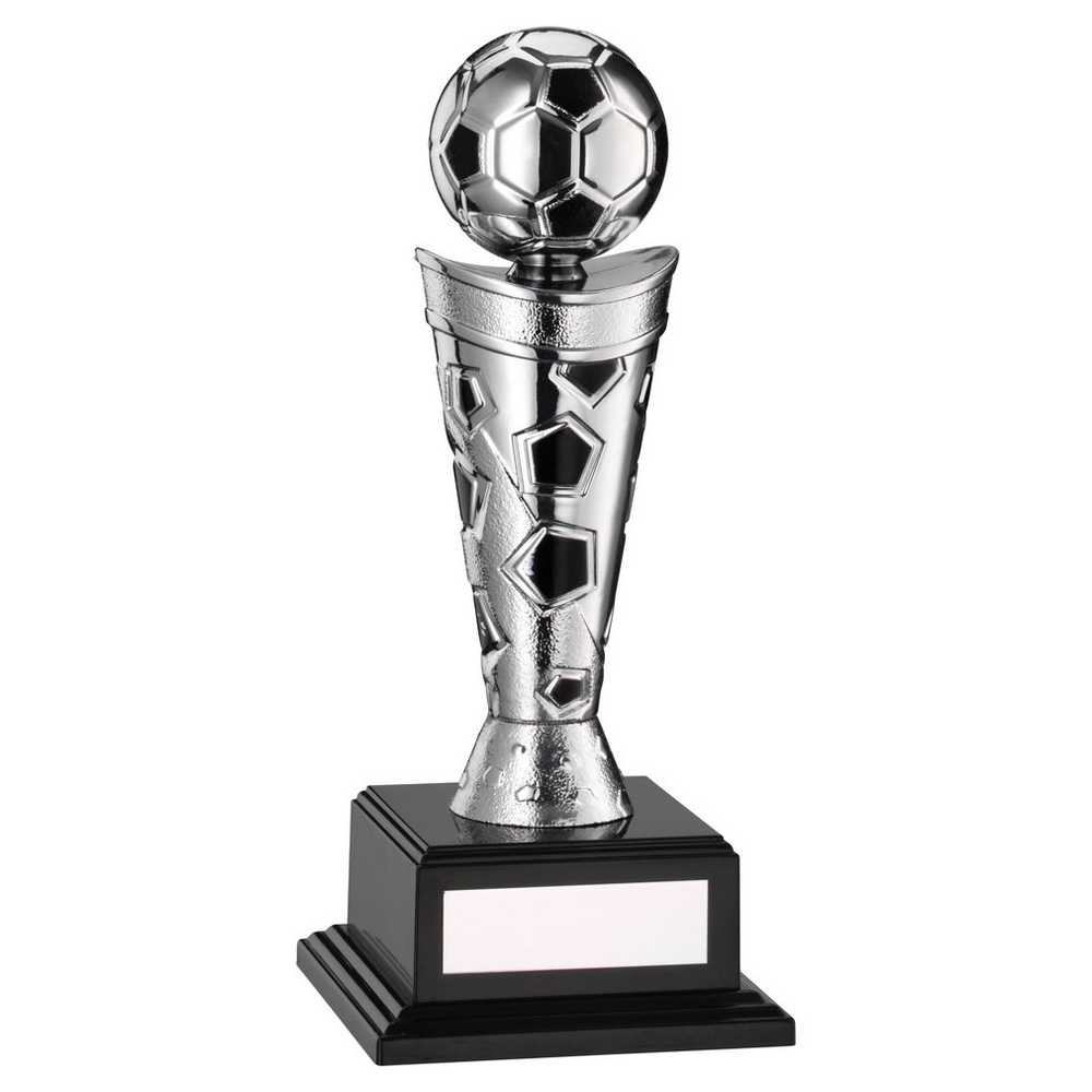 SILVER/BLACK PLASTIC FOOTBALL FIGURE ON BASE - 7.5in