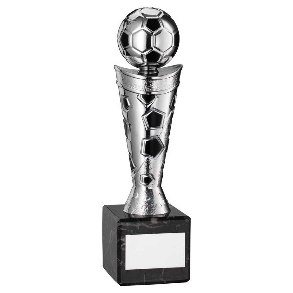 SILVER/BLACK PLASTIC FOOTBALL FIGURE ON BLACK MARBLE TROPHY - 8in
