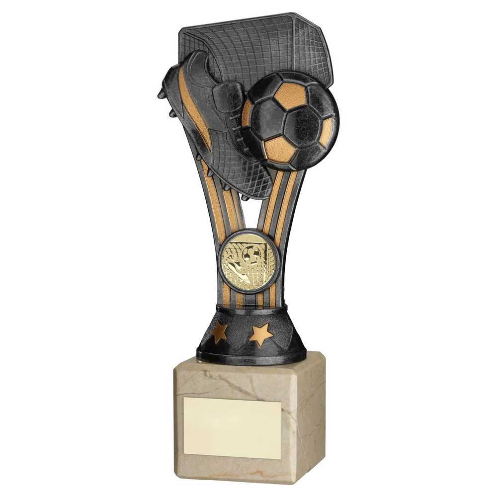 PEWTER/GOLD PLASTIC 'WEMBLEY' FIGURE ON CREAM MARBLE TROPHY - (1in CEN) - 8in