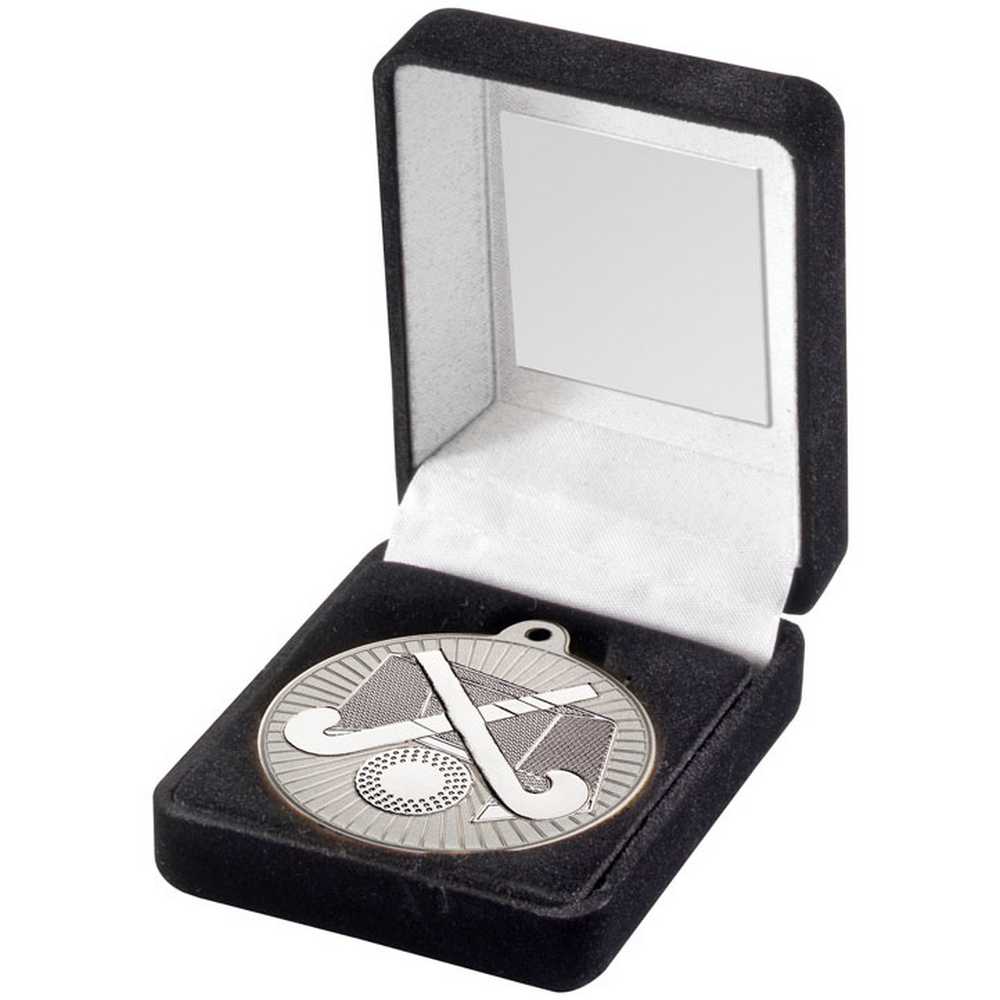 BLACK VELVET BOX AND 50mm HOCKEY MEDAL TROPHY MATT SILVER/SILVER - 3.5in