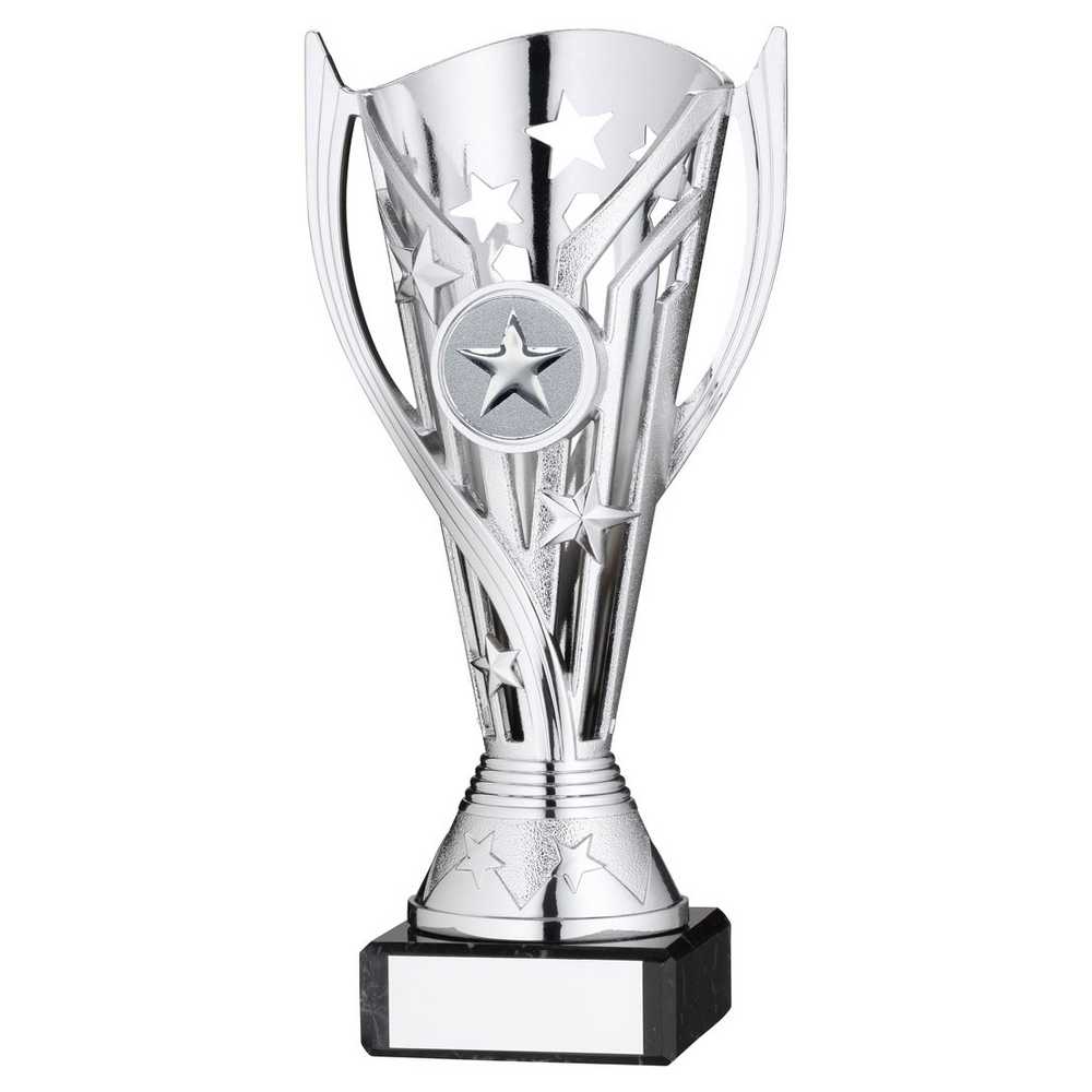 SILVER PLASTIC 'FLASH' CUP ON BLACK MARBLE ASSEMBLED TROPHY (1" CEN) - 6.75in