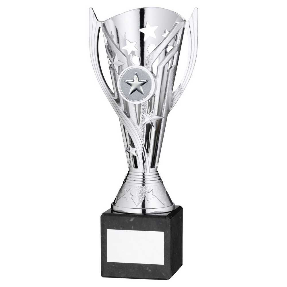 SILVER PLASTIC 'FLASH' CUP ON BLACK MARBLE ASSEMBLED TROPHY (1" CEN) - 8in