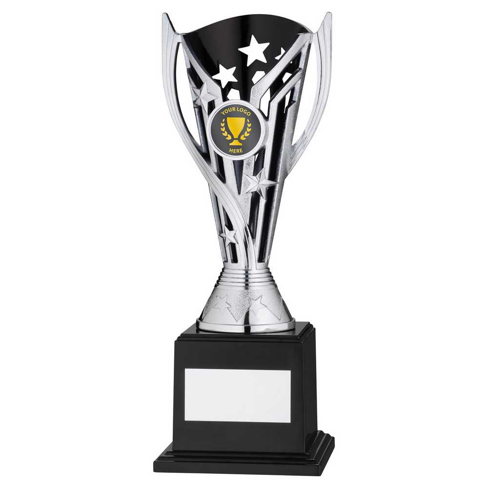 SILVER/BLACK PLASTIC 'FLASH' CUP ON BASE ASSEMBLED TROPHY (1" CEN) - 8.5in