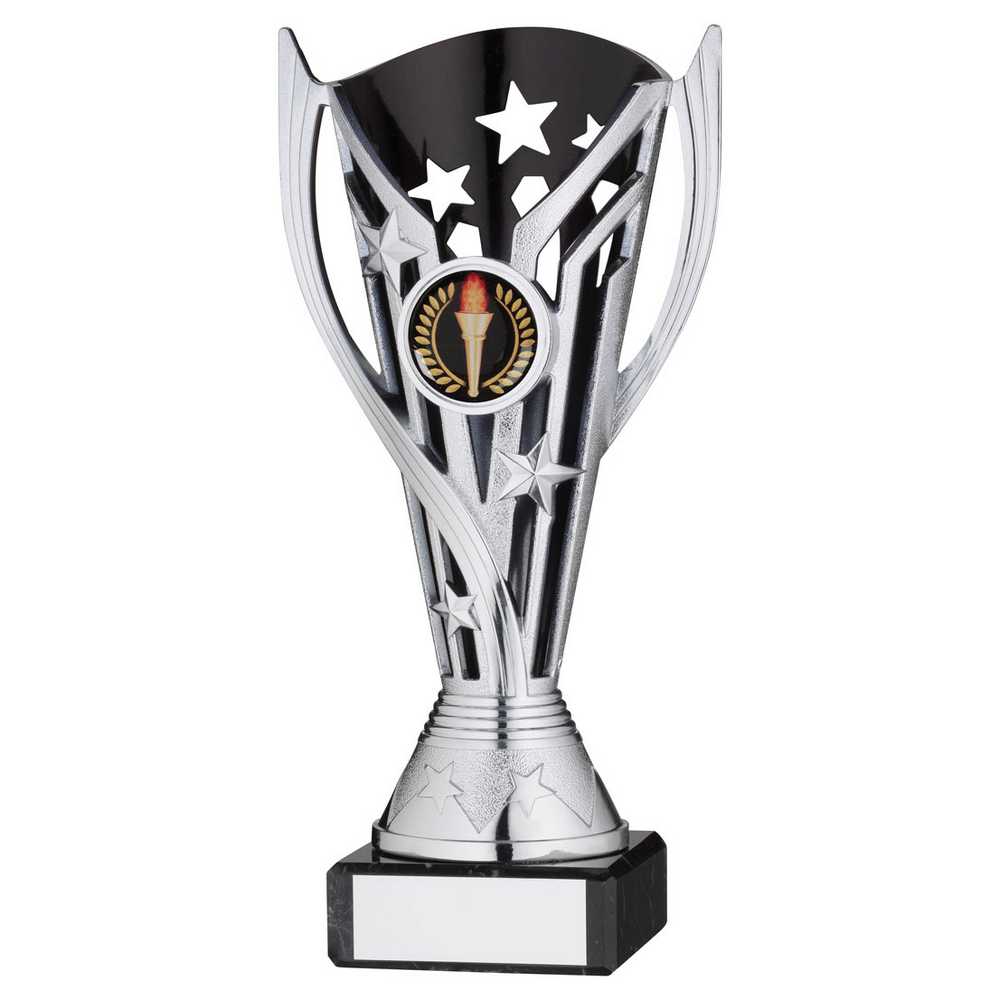 SILVER/BLK PLASTIC 'FLASH' CUP ON BLK MARBLE ASSEMBLED TROPHY (1" CEN) - 6.75in