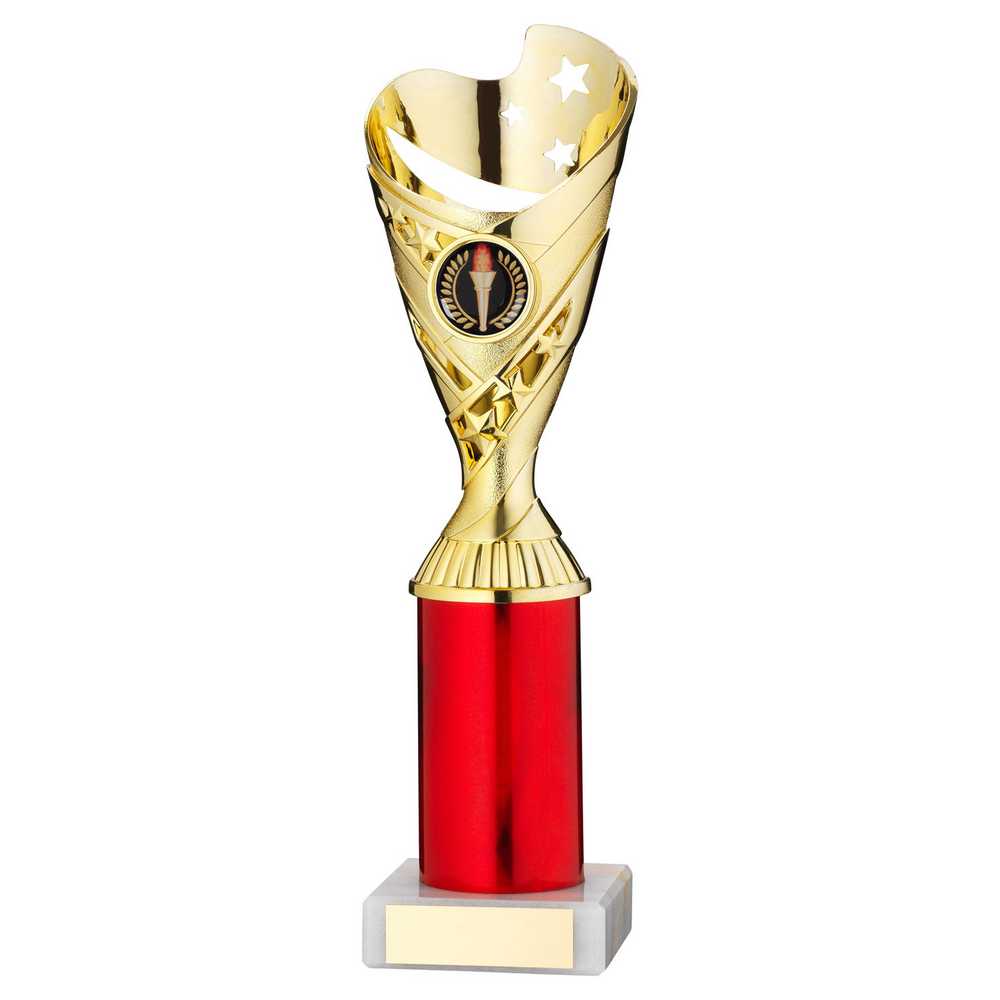 GOLD/RED PLASTIC 'SABRE' CUP ASSEMBLED ON MARBLE (1in CEN) - 10in