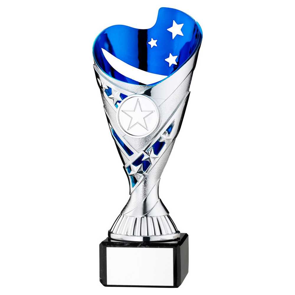 SILVER/BLUE PLASTIC 'SABRE' CUP ON BLK MARBLE ASSEMBLED TROPHY (1" CEN) - 7.25in